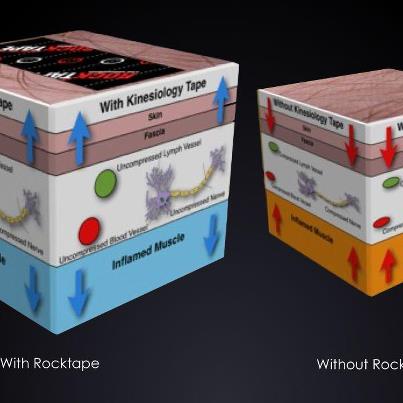 Between our skin and muscles is a think layer of fluid known as lymphatic fluid. It is basically the sewer system for our bodies, removing waste from the muscles in the area. When we have injuries, there is an excess of waste that builds up in the injured area and the increase in pressure sends signals to little sensors housed in the fascia, which also lies between the skin and the muscles. These sensors tell your brain that something is wrong and your brain in turn tries to get you to stop using the area by making it hurt. By creating a lifting effect on the skin, Rocktape helps injuries by reducing the pressure to the taped area, which lessens the pain signals sent to the brain.